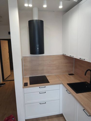 Снимем старые дверцы. Вырежем отверстия под петли, сделаем разметку и прикрепим ручки. Навесим и отрегулируем новые дверцы. Работа займёт 30–60 мин. Будет шумно.